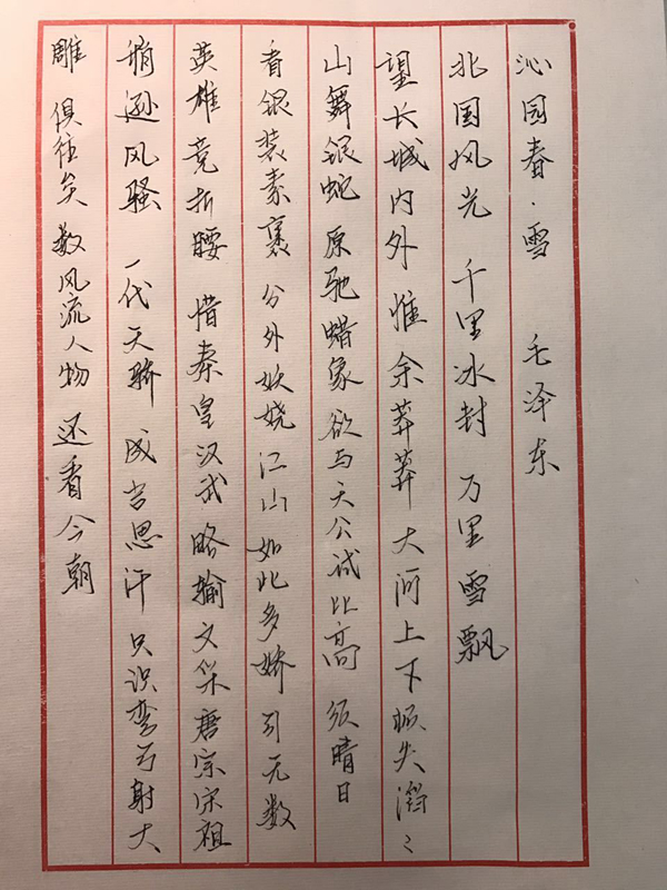紧接着,一首"沁园春.雪"在老师们的笔尖下缓缓流出,笔力劲挺、行云流水,各具特色,精彩纷呈。老师们以笔为剑,以字为刃,在学习的道路上柔韧而又坚毅的前行。