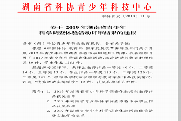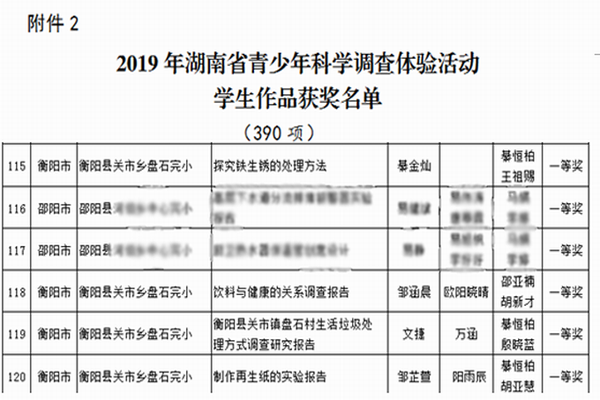 2019年湖南省青少年科学调查体验活动评审结果揭晓:衡阳县关市镇盘石完全小学申报的四个项目全部获得学生作品类省一等奖。为衡阳市科技教育在该类赛事中争光添彩。