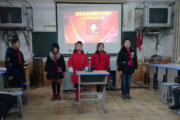 2018年12月26日是伟大领袖毛泽东诞辰125周年的日子.为培养少年儿童的高尚品质,对党和社会主义祖国的真挚感情。激发同学们对爱国主义经典诗词的浓厚兴趣,衡阳县金兰镇中心小学隆重举行了“纪念毛主席诞辰125周年暨毛泽东诗词诵读比赛”活动。