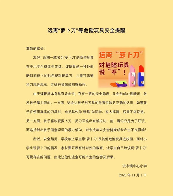 学校还通过微信向家长发放《远离“萝卜刀”等危险玩具安全提醒》,告知家长切实履行监护责任,避免孩子接触和购买“萝卜刀”等危险玩具。家校协同,共筑安全屏障,为学生们的健康成长保驾护航。