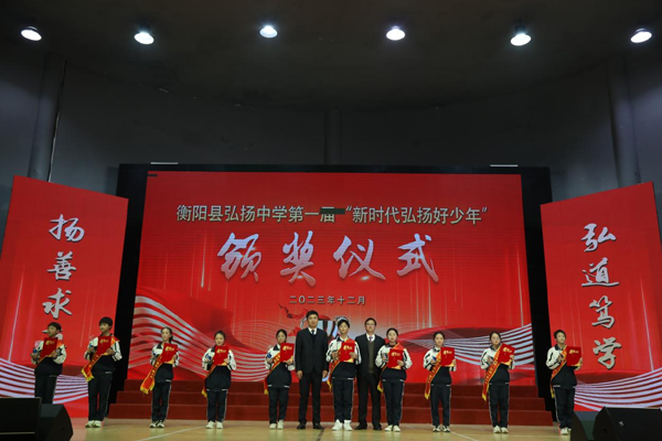 12月28日下午,弘扬中学2024年元旦文艺汇演如火如荼,在这个重要时刻,2100余名弘扬师生、数百名学生家长齐聚衡阳县一中体育馆,载歌载舞同迎新年。3个小时25个演出节目,程序极其紧凑!演出过程中,元旦晚会专门为10名学生设置一个环节,这是属于他们的高光时刻,这就是——第一届“新时代弘扬好少年”颁奖典礼。