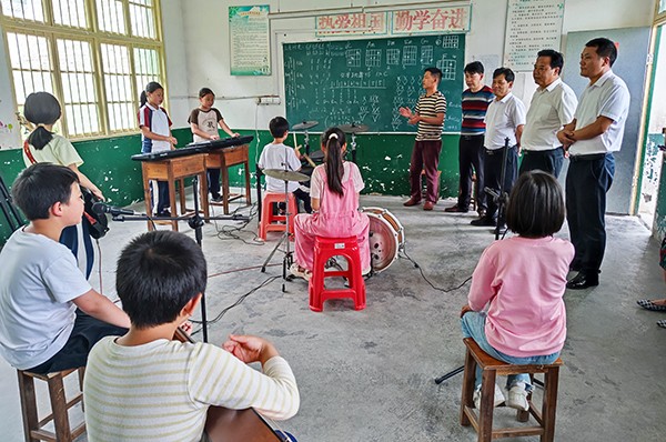 刘炳辉一行来到了偏远村小妙溪小学,参观了妙溪小学的劳动教育基地和音乐教室,观看了该校“一起乐队”的现场演奏,详细了解了该校公益课堂和妙溪乐队的开展情况,并与支教老师进行了对谈。刘炳辉说,公益课堂是岣嵝乡教育的一大特色,尤其是像妙溪小学这样以艺术公益课堂教育为主的村小,是乡村学校素质教育的创新形式,要着力打造精品小学,抓住特色,形成模式。