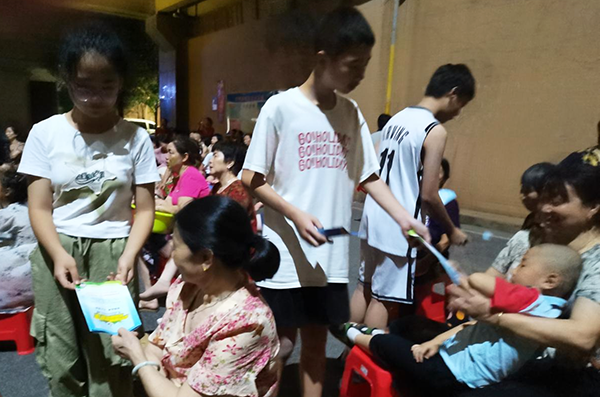 8月14日傍晚,夜风习习,居民又纷纷走到室外消暑纳凉。“今晚是安排放禁毒电影”“我们去摆放凳子”“你准备一下禁毒宣传手册”……居住在滨江社区的弘扬中学部分学生,根据志愿服务日程安排,早早就集结在社区办公室,和工作人员有条不紊地忙开了。