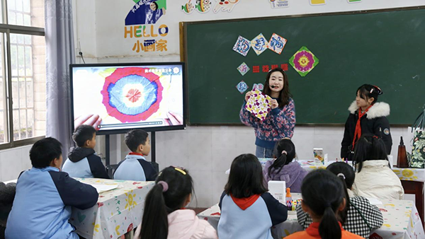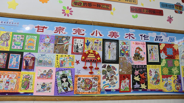 在甘泉完小,学校引进专业老师,将美术课程与传统的非遗技艺相融合,并结合农村小学的教学特点,开设创意树叶贴画、扎染等美术校本课程,让乡村学生享受更好的教育。