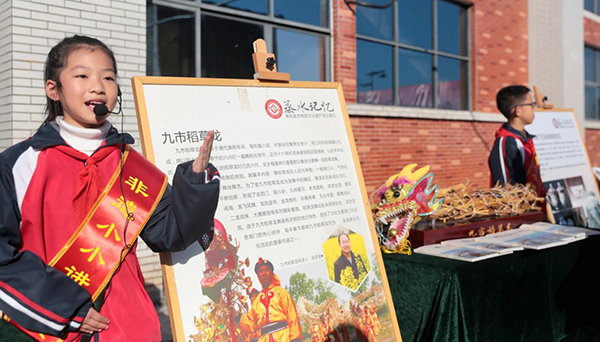图:非遗“小小讲解员”正在讲解九市稻草龙的历史