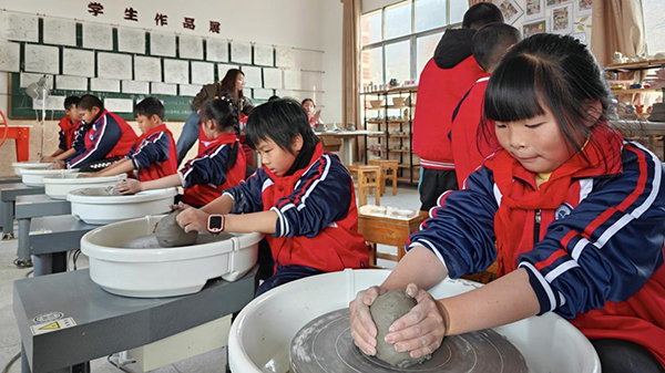 衡阳县还充分挖掘利用非遗文化资源,因地制宜开设特色课程。台源镇瑞基小学成立“九市稻草龙”课外兴趣小组,由省级非遗传承人联合村里和学校成立九市稻草龙传习所,让学生了解稻草龙的编制方法和舞龙技艺。界牌镇银瓷完小将省级非遗项目——界牌釉下五彩瓷引入校园,打造陶艺体验中心,组建陶艺兴趣小组,丰富学生的校园文化生活。