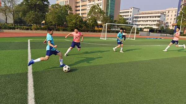 比赛场上,双方队员精神抖擞,你追我赶,互不相让。赛场就像一个战场,每一个选手都是勇敢的战士,他们用汗水和毅力诠释着比赛的激烈与魅力。球员们的动作流畅而果断,追逐着足球的轨迹,奔跑、冲刺、拼抢,在球场上来回穿梭。每个队伍都竭尽所能,为获得最后的胜利而不遗余力。六(2)班的王明洋队员一个漂亮的运球、带球、干脆漂亮的射门赢得了观众的阵阵掌声和喝彩,观众的热情也被点燃,给全校的师生留下了深切的印象。