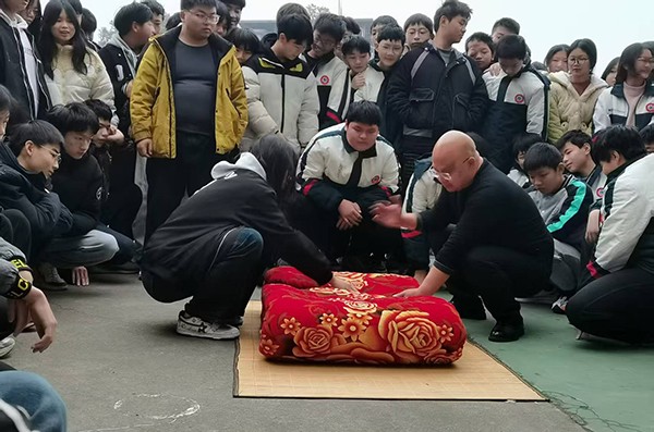 全体学生在班主任的带领下排着整齐的队伍在操场上集会,校长将课堂搬到操场上,并亲自示范,着重向同学们讲解叠“豆腐块”的“四折法”。