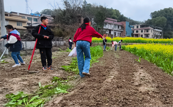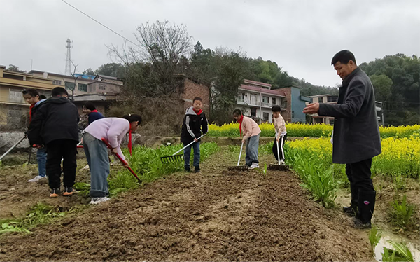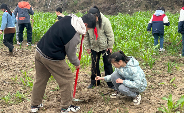 在种植间隙,同学们还在田埂边播撒下石竹种子。大家蹲在田埂旁,将一颗颗细小的种子均匀地撒在松软的土壤上,再轻轻覆盖上一层薄土,期待着不久后这里能绽放出五彩斑斓的花朵。