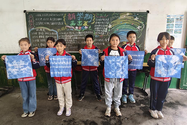 拆开绳索的瞬间,课堂变成了充满惊喜的海洋。由于扎结力度、手法的不同,每一件作品都呈现出独一无二的蓝白图案,或如云卷云舒,或如青花瓷韵。孩子们看着自己创造的独具美感的扎染作品,脸上洋溢着成功的喜悦和自豪。同学们纷纷表示,这堂课不仅好玩,更让他们深刻体会到了耐心、专注和创造力的重要性,理解了手工艺的内涵。