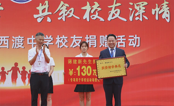 西渡中学94届校友、广东时力健身集团董事长蒋建新与校领导共同为新建成的塑胶跑道揭幕。蒋建新捐赠的130万元善款专项用于运动场塑胶跑道建设,如今工程已全面完工并投入使用。校方向蒋建新先生颁发了“捐资助学典范”荣誉,以褒奖其对母校发展的大力支持。自2023年起,蒋建新已连续3年为母校捐资捐物,累计金额160余万元。在他的带动下,当天80多名校友自发捐赠20余万元现金和9万元物资,用于支持母校教育事业发展。