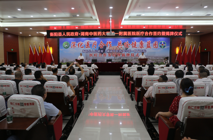 当天上午,湖南中医药大学第一附属医院与衡阳县人民政府签订《湖南中医药大学第一附属医院与衡阳县人民政府合作办医战略框架协议》,与衡阳县中医医院签订《医疗合作协议书》。秦裕辉、肖文明、杨洪峰、刘英、曾秀、陈新宇共同为“湖南中医药大学第一附属医院集团衡阳县医院”揭牌。孙鹏伟、蒋达宏、杨秋良、唐仕海共同为“中共衡阳县中医医院总支委员会” 揭牌。