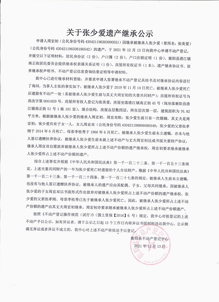 关于张少爱遗产继承公示