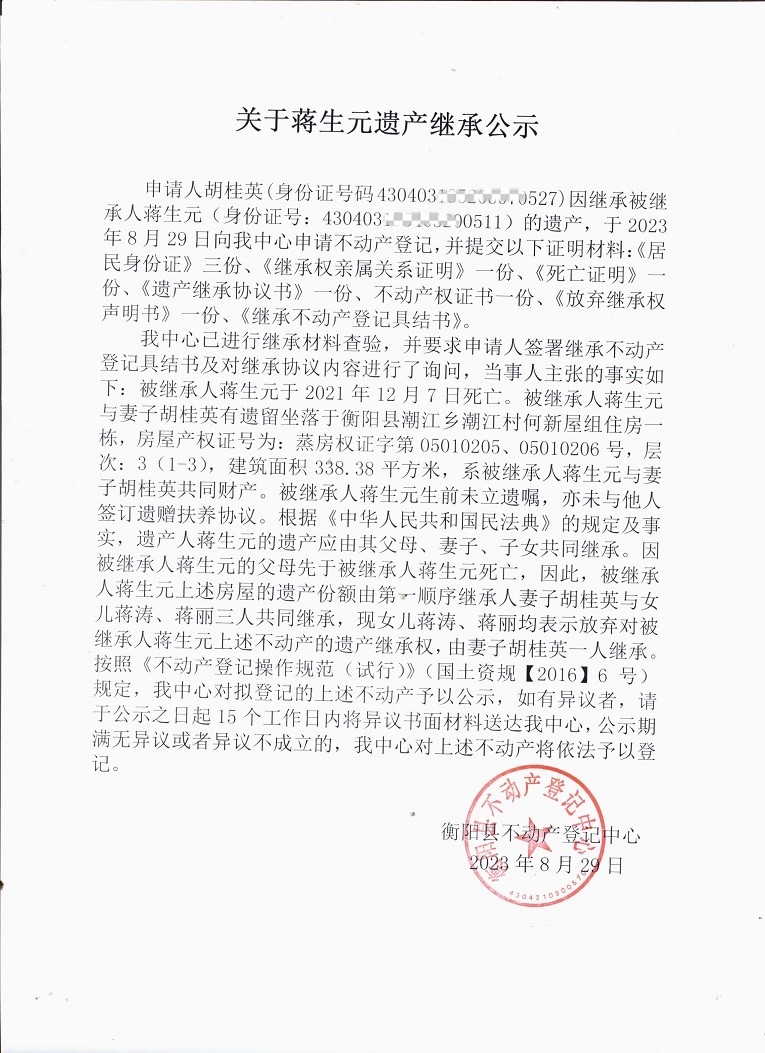 关于蒋生元遗产继承公示