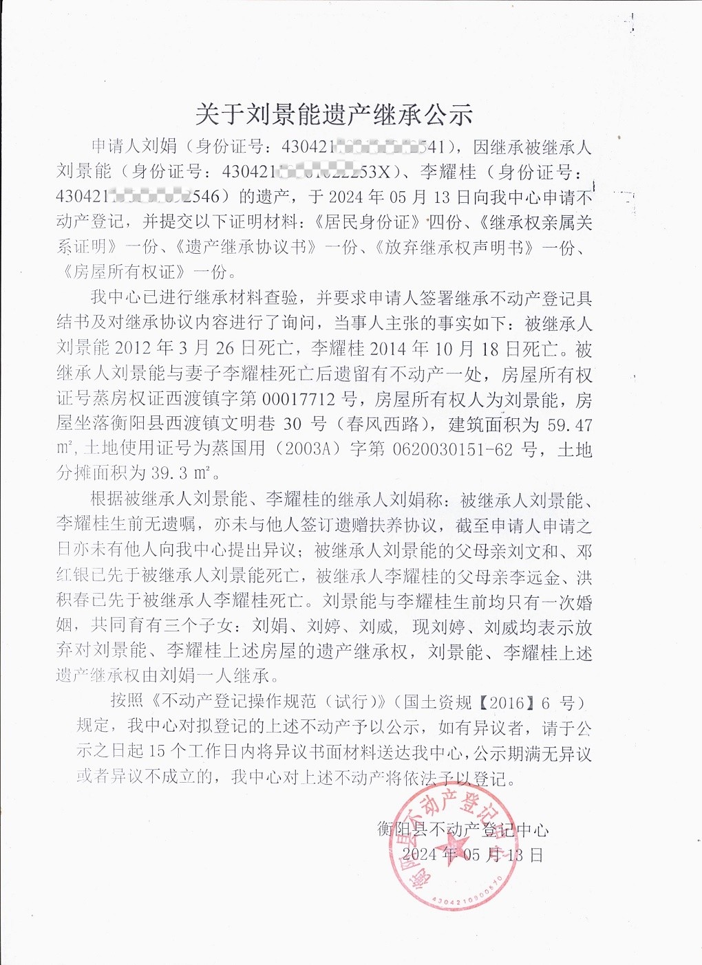 关于刘景能遗产继承公示