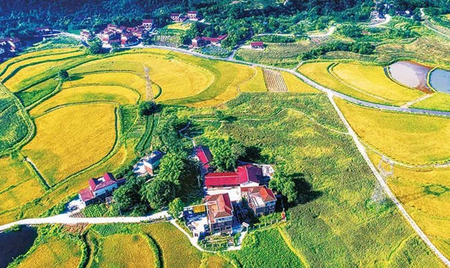 近年来,重庆市以国土综合整治为抓手,统筹推进山水林田湖草系统治理和美丽宜居乡村建设。图为2021年8月25日,九龙坡区西彭镇新民村国土综合整治项目区的水稻迎来丰收季。自然资源部供图 龚安平/摄