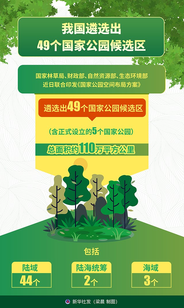 国家林草局、财政部、自然资源部、生态环境部近日联合印发《国家公园空间布局方案》,遴选出49个国家公园候选区(含正式设立的5个国家公园),总面积约110万平方公里。全部建成后,中国国家公园保护面积的总规模将是世界最大。