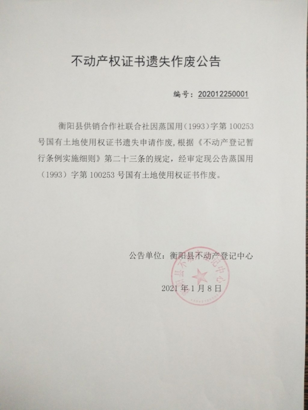 关于蒸国用(1993)字第100253号国有土地使用证书遗失作废公告