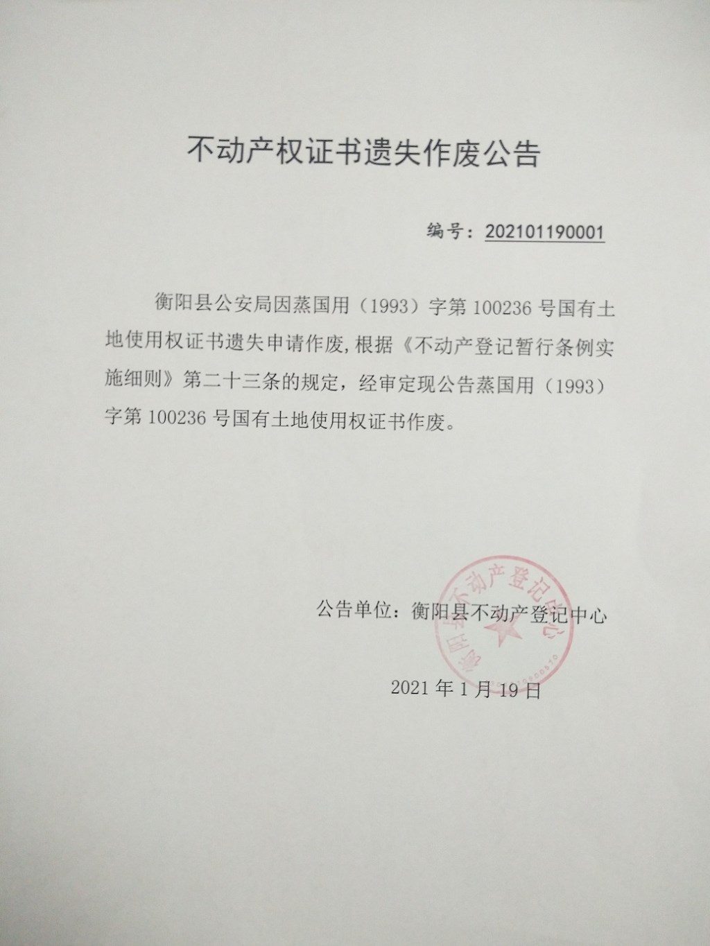 关于蒸国用(1993)字第100236号国有土地使用证遗失作废公告