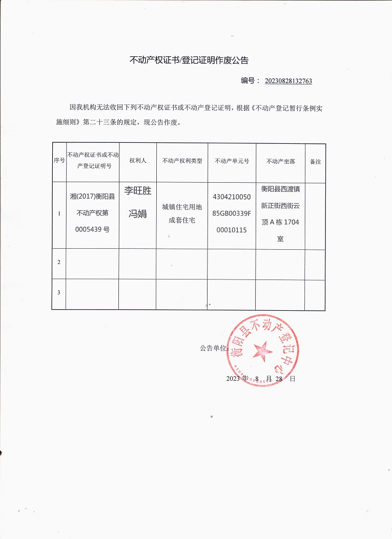 关于湘(2017)衡阳县不动产权第0005439号不动产证书作废公告