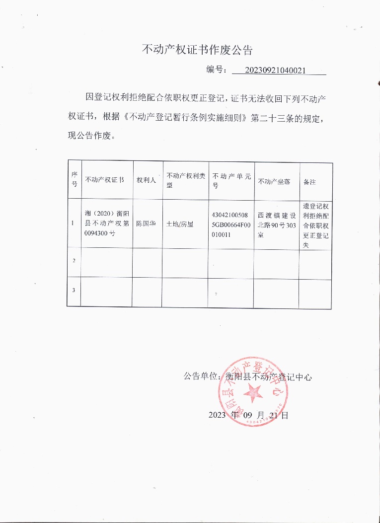 关于湘(2020)衡阳县不动产权第0094300号不动产证书作废公告