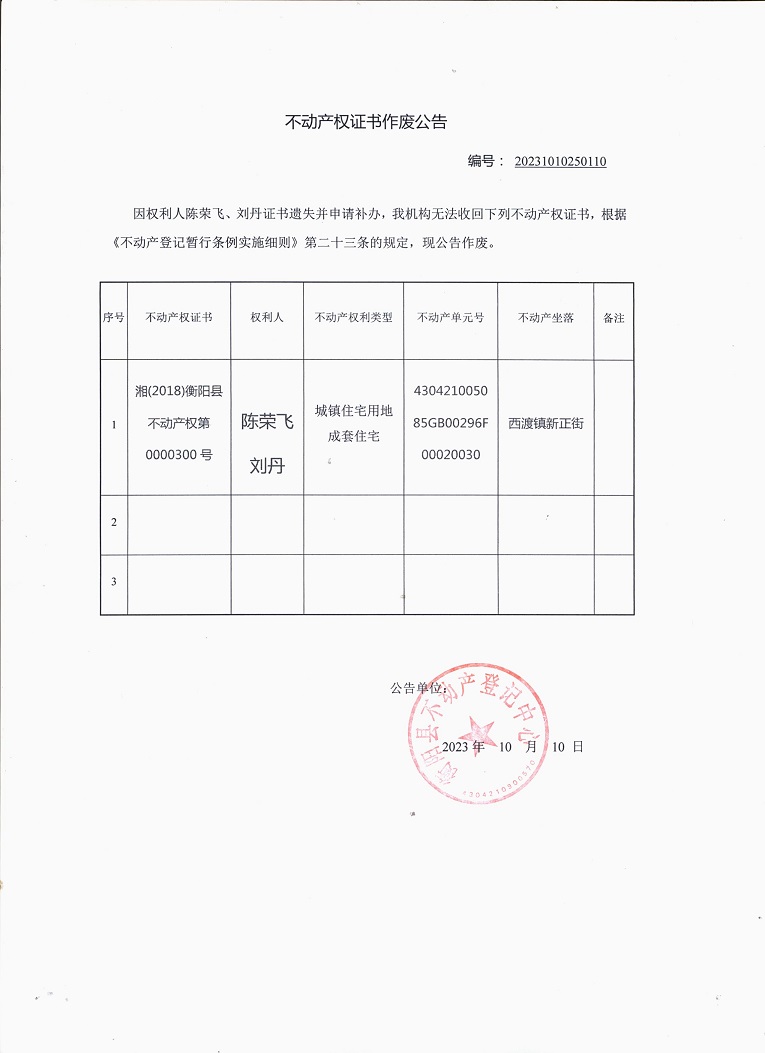 关于湘(2018)衡阳县不动产权第0000300号不动产证书作废公告