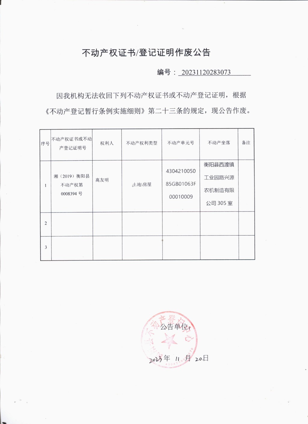 关于湘(2019)衡阳县不动产权第0008394号不动产证书作废公告