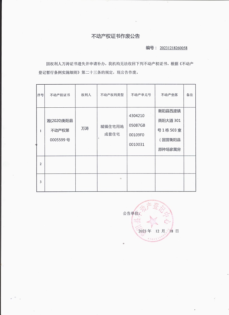 关于湘(2020)衡阳县不动产权第0005599号不动产证书作废公告