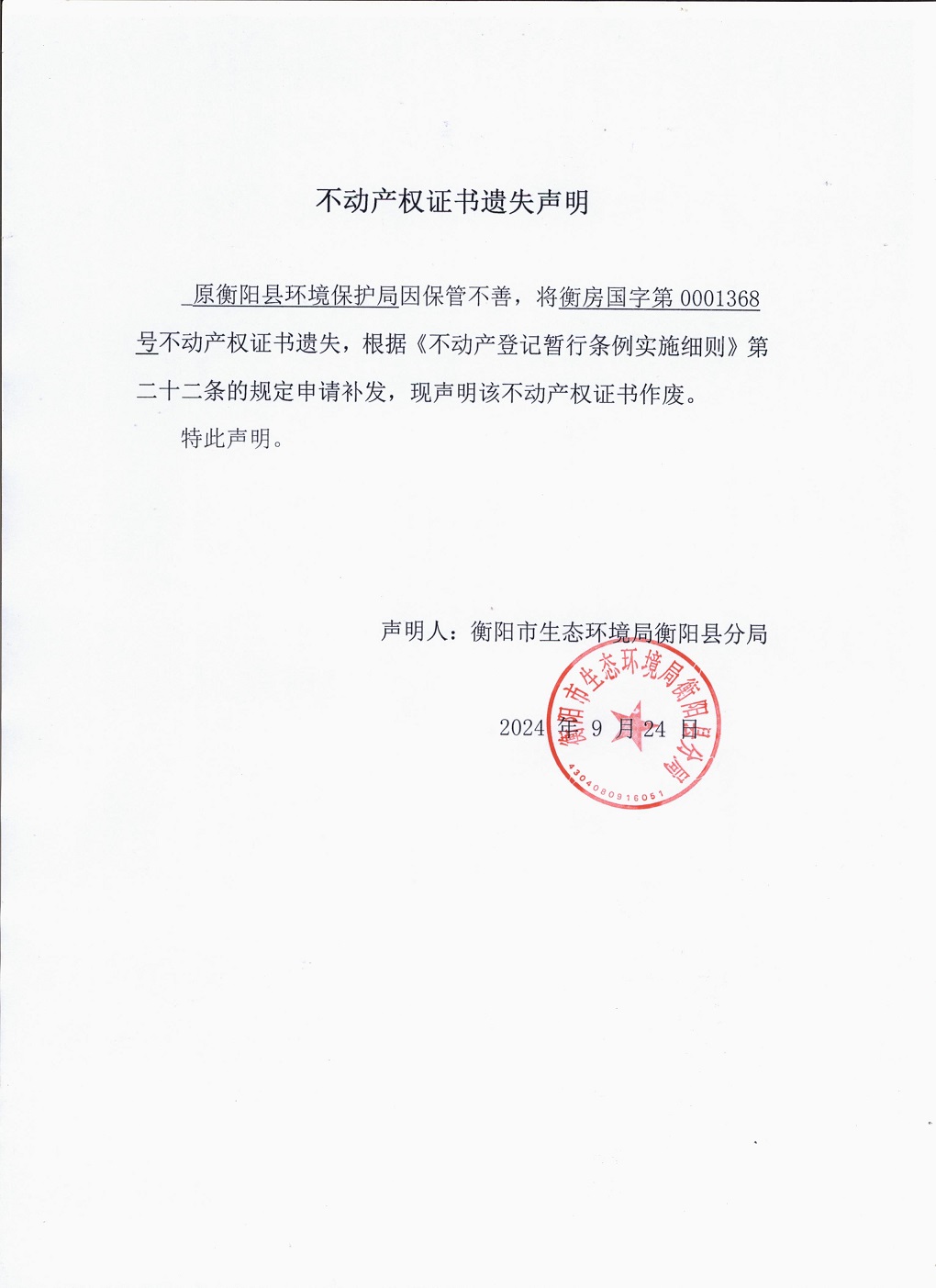 不动产权证书遗失声明(衡阳县环境保护局)