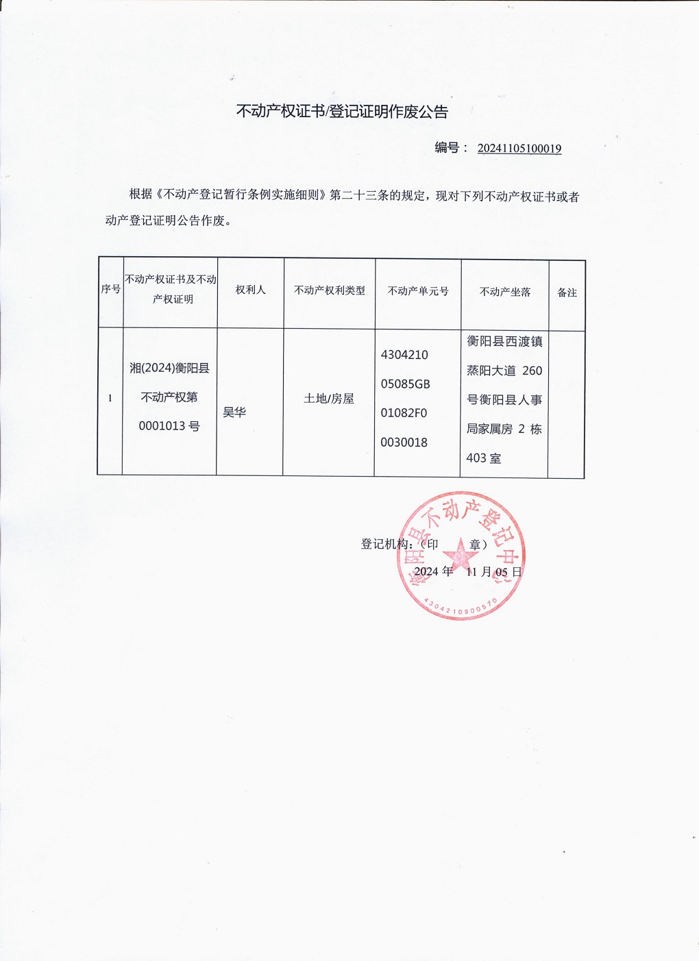 关于湘(2024)衡阳县不动产权第0001013号不动产权证书作废公告