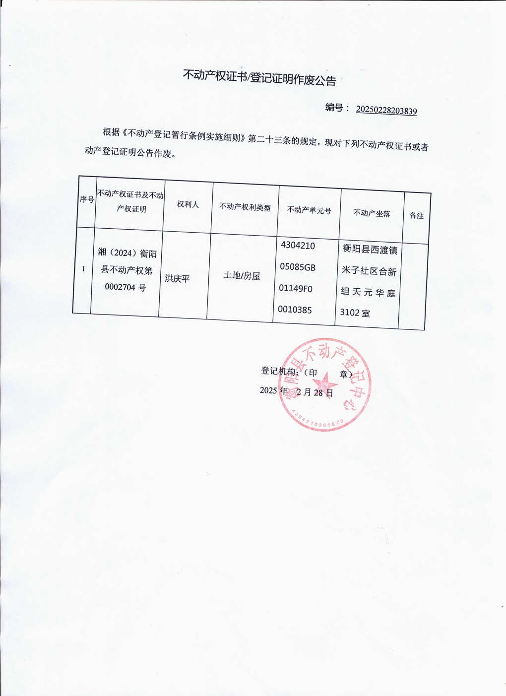 关于湘(2024)衡阳县不动产权第0002704号不动产权证书作废公告