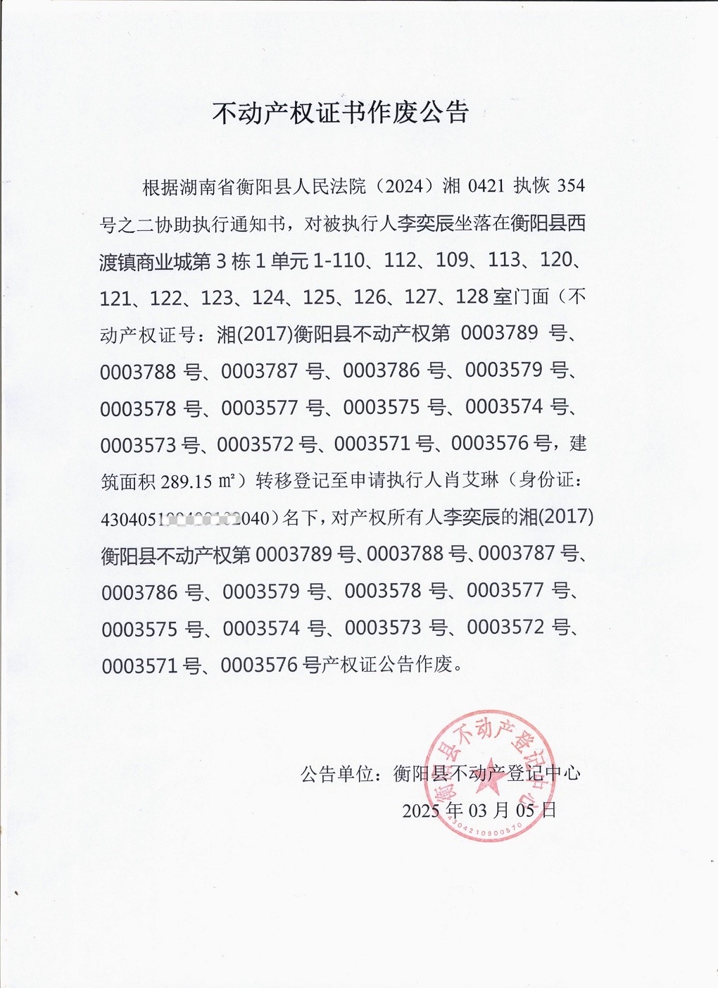 关于湘(2017)衡阳县不动产权第0003789号、湘(2017)衡阳县不动产权第0003788号等13本不动产权证作废公告