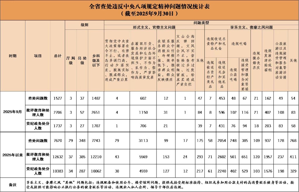 2025年9月,全省各级纪检监察机关共查处违反中央八项规定精神问题1527起,批评教育和处理2706人,其中给予党纪政务处分1737人,占处理人数的64.19%。