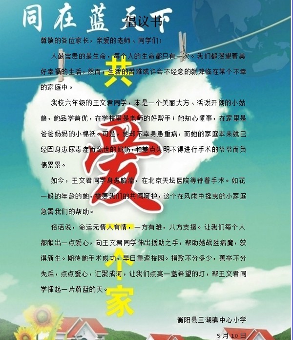 衡阳县三湖镇中心小学全体师生用爱心点燃希望,把真情洒满校园,谱写了一曲爱的乐章。