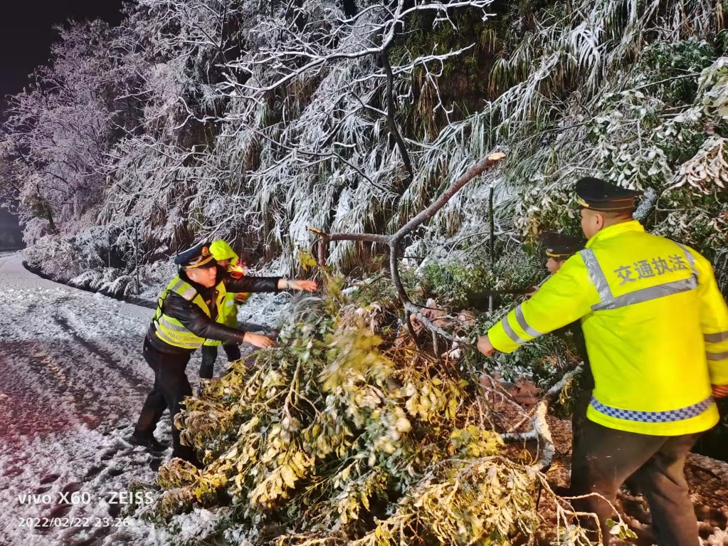县交通、公路部门清理倒伏树木,救助被困车辆。