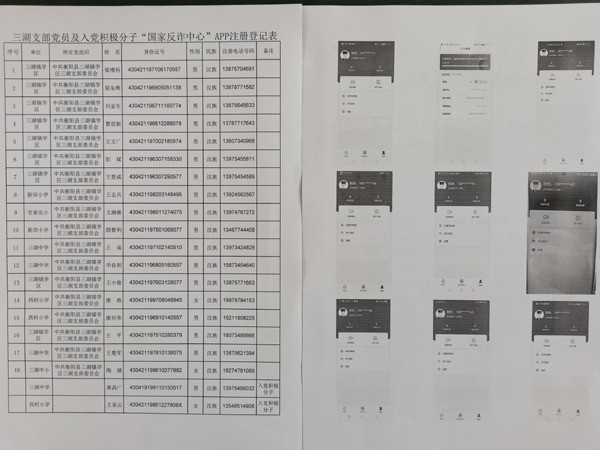 2022年9月20日下午,中共三湖镇学区三湖支部在支部活动开展主题为“党员先行、全民反诈”主题党日活动。主题党日活动由支部书记王小俊同志主持。首先是支部组织委员王平同志组织学习习了中共衡阳市委组织部《关于在全市基层党组织开展“党员先行、全民反诈”主题活动的通知》;其次全体党员、入党积极分子按照通知要求当场下载、注册“国家反诈中心”APP;最后,全体成员向支部递交《不参与电信网络诈骗犯罪承诺书》,纷纷表示要主动推广应用“国家反诈中心”APP ,以实际行动来宣传反诈知识,维护自身和群众的切身利益。
