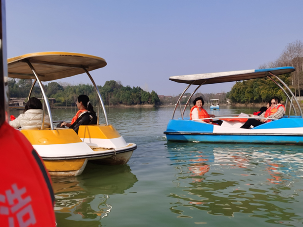 下午,参加活动的女教职工抵达双水湾乡村文化园。沿着石板小路参观牌楼、古街、圣贤殿、芳草地、竹鸡楼感受“大雁文化”的内涵魅力。随后大家自由活动:女同胞们脚踏小船荡漾湖光山色间;晃荡秋千放飞自我;彩虹桥上齐心协力尽情摇摆;近距离观赏湖面嬉戏、空中飞翔的大雁……