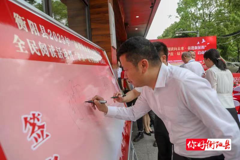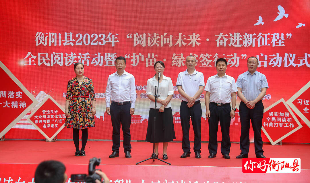 活动现场,伴随着歌舞《少年中国说》、小品《无处可逃》等一个个精彩的文艺表演,衡阳县2023年“阅读向未来·奋进新征程”全民阅读活动暨“护苗·绿书签行动”正式启动。县委常委、宣传部部长李桦、副县长罗士夫带头在全民阅读签名墙上签名,倡导全社会形成热爱阅读的良好风尚。