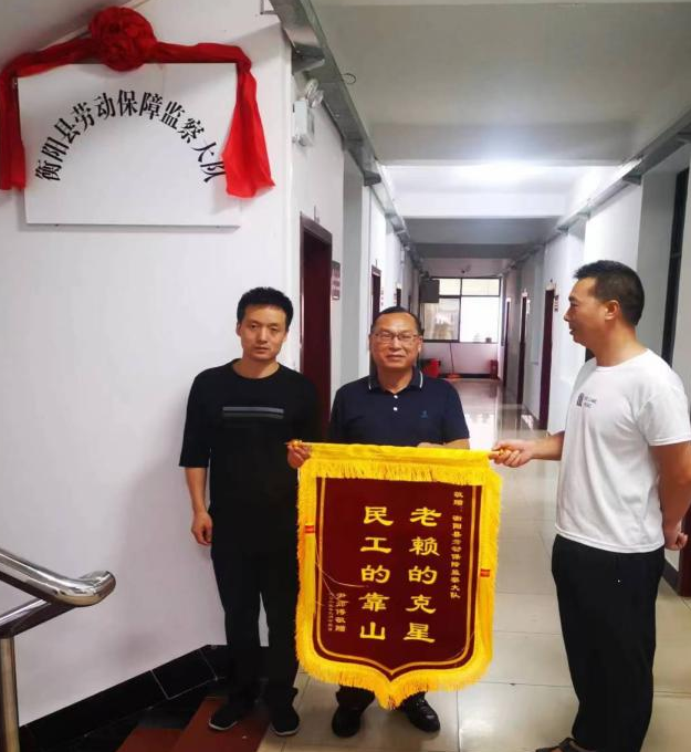 9月14日上午,一面写有“老赖的克星、民工的靠山”的锦旗,被送到衡阳县劳动保障监察大队监察员手中。劳动者尹某握着工作人员的手表示感谢。因为在这些工作人员的帮助下, 顺利地讨回了6000余元工资。事情的原委要从今年的8月29日说起。