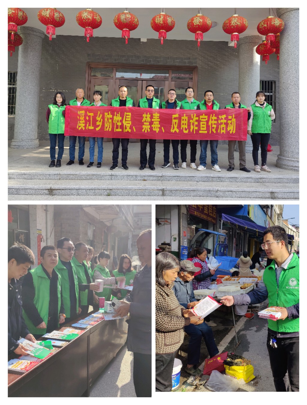 溪江乡利用赶集日开展抵御涉毒风险防范教育宣传活动。乡政府干部、派出所民警向过往行人、商贩讲解传统毒品和新型毒品的种类,吸毒对个人、家庭和社会的严重危害,青少年、外出务工人员如何预防毒品等方面的知识,告诫群众要认清毒品危害,坚决抵制毒品。