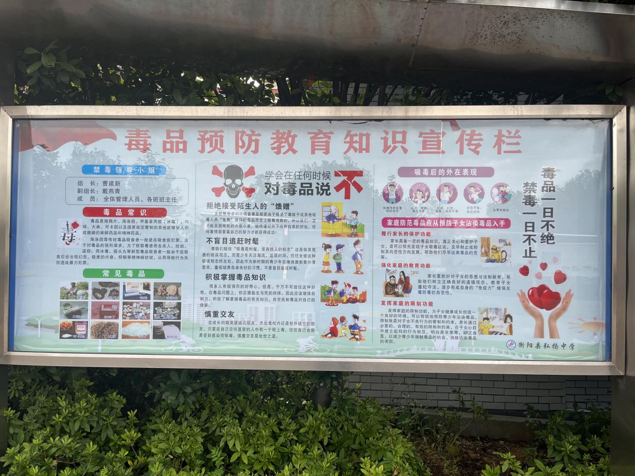 弘扬中学多层面、多渠道开展“珍爱生命、远离毒品”宣教活动。学校充分利用校园广播、宣传栏等传播媒介和主题班会、禁毒征文等形式,让全体学生深刻认识毒品违法犯罪的现实危害性,教导大家要当好禁毒宣传员和监督员。