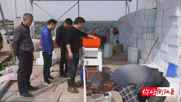 在岘山镇田心村,种粮大户曾卫正组织村民通过水稻育苗播种机进行育秧流水作业,秧盘经过垫土、撒种、覆土后,再送到育秧大棚生长。往年他都是在大田里育秧,费时费力,秧苗质量也不高。今年,他引进了一套智能育秧流水线,一天可以制作6000个秧盘,并新建了一座三千多平米的育秧大棚,一批次可以育四百多亩早稻秧,成活率高且不受天气影响,相比传统育秧可提前7到10天,能够为早稻提前插秧赢得时间。