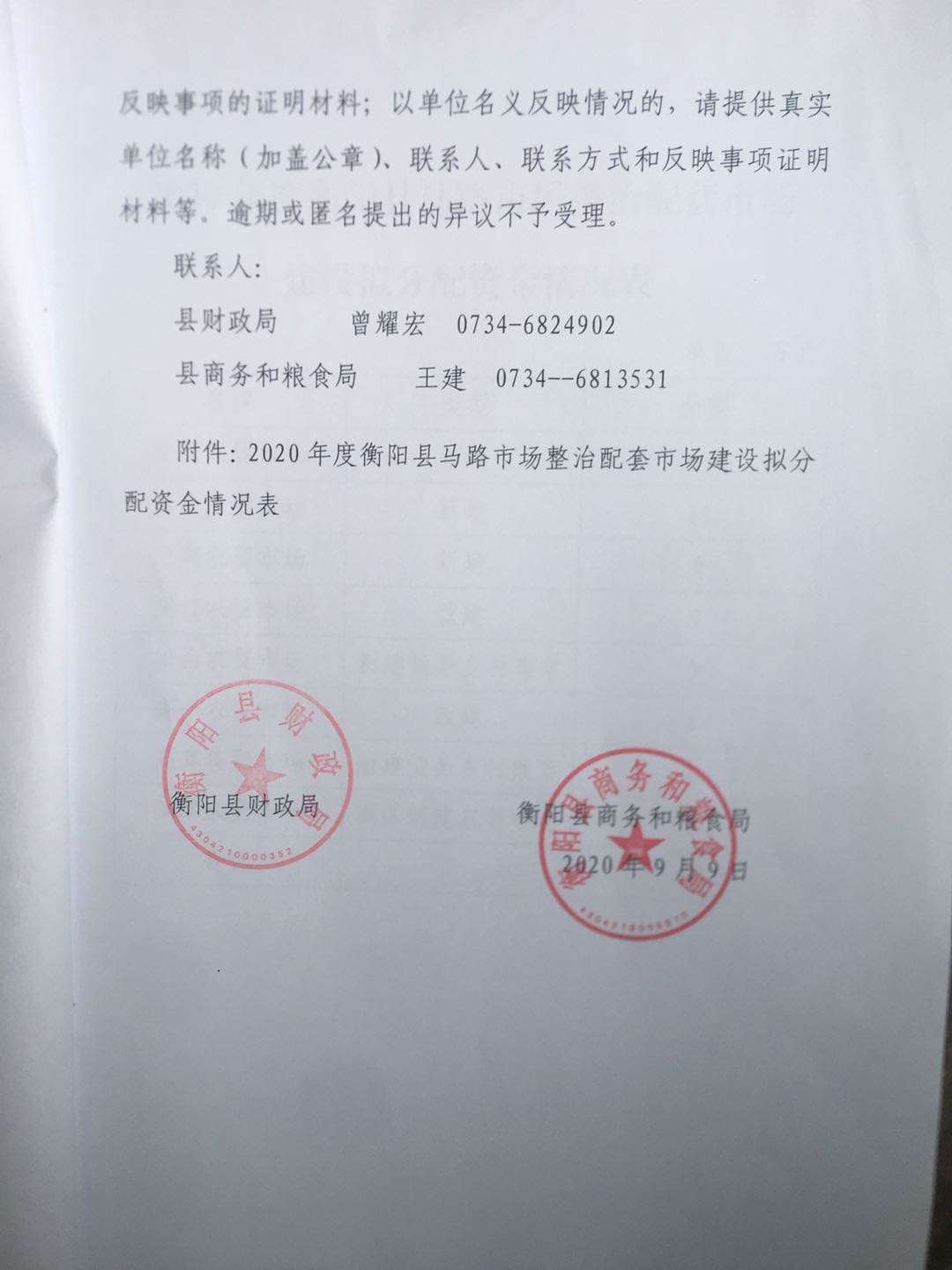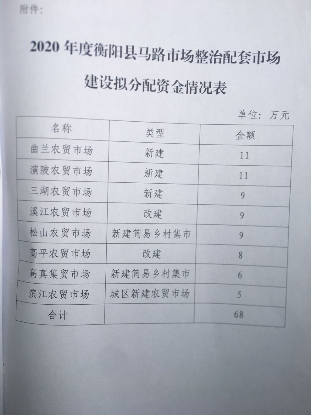 关于2020年衡阳县马路市场整治配套市场建设资金拟支持项目公示