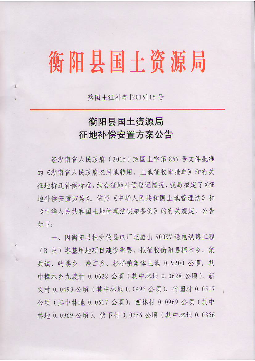 蒸国土征补字【2015】15号征地补偿安置方案公告
